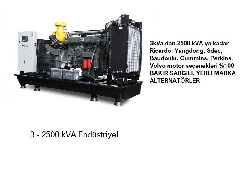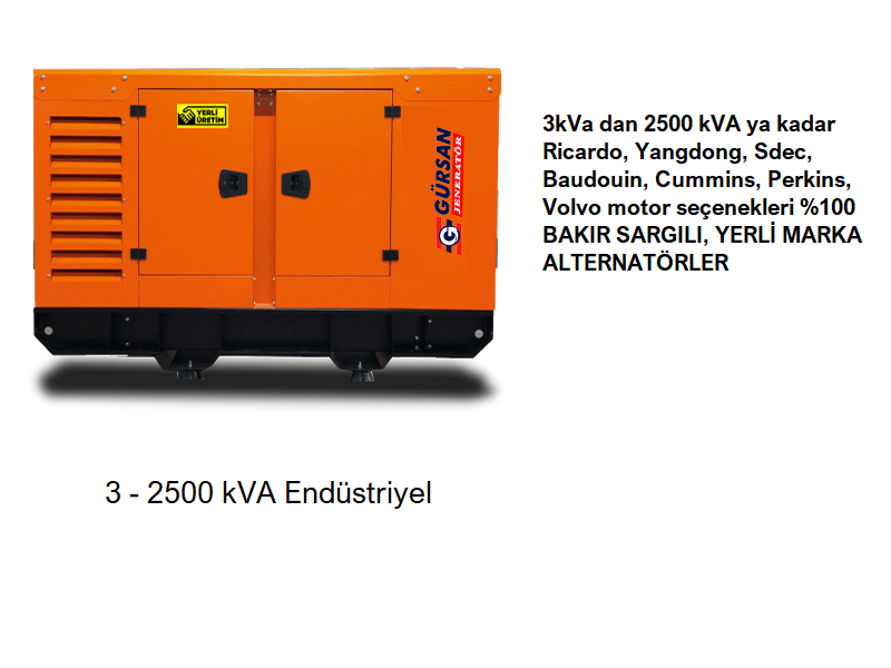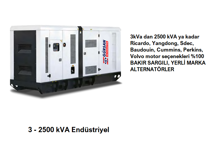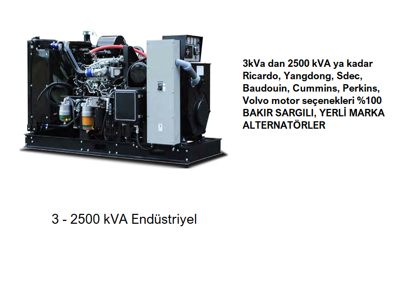 3KVA ile 2500 KVA arası dizel ve benzinli jeneratörlerimiz mevcuttur